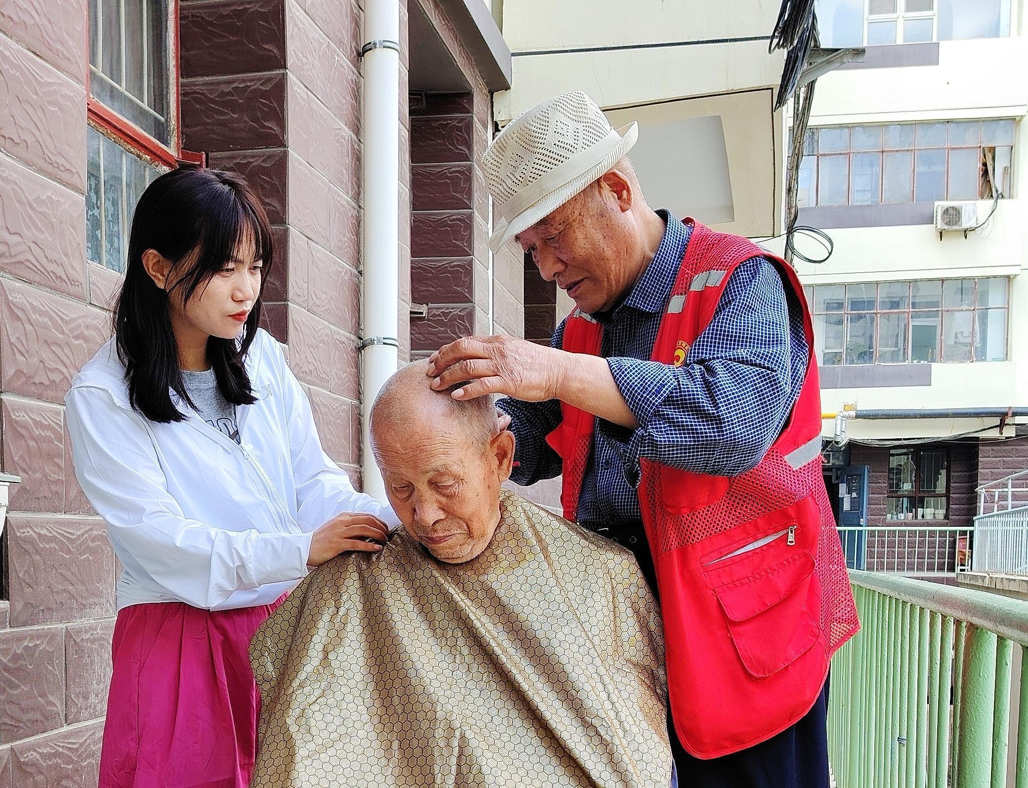 杨茂生(图右)为唐素琴的老伴刘兆荣理发,网格员李小华(图左)在一旁帮忙。